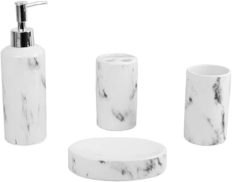 Home Basics Marble Design Look, Ceramic 4-Piece Durable Bath Accessory Set, includes Lotion Dispenser, Soap Dish, Tumbler, Toothbrush Holder