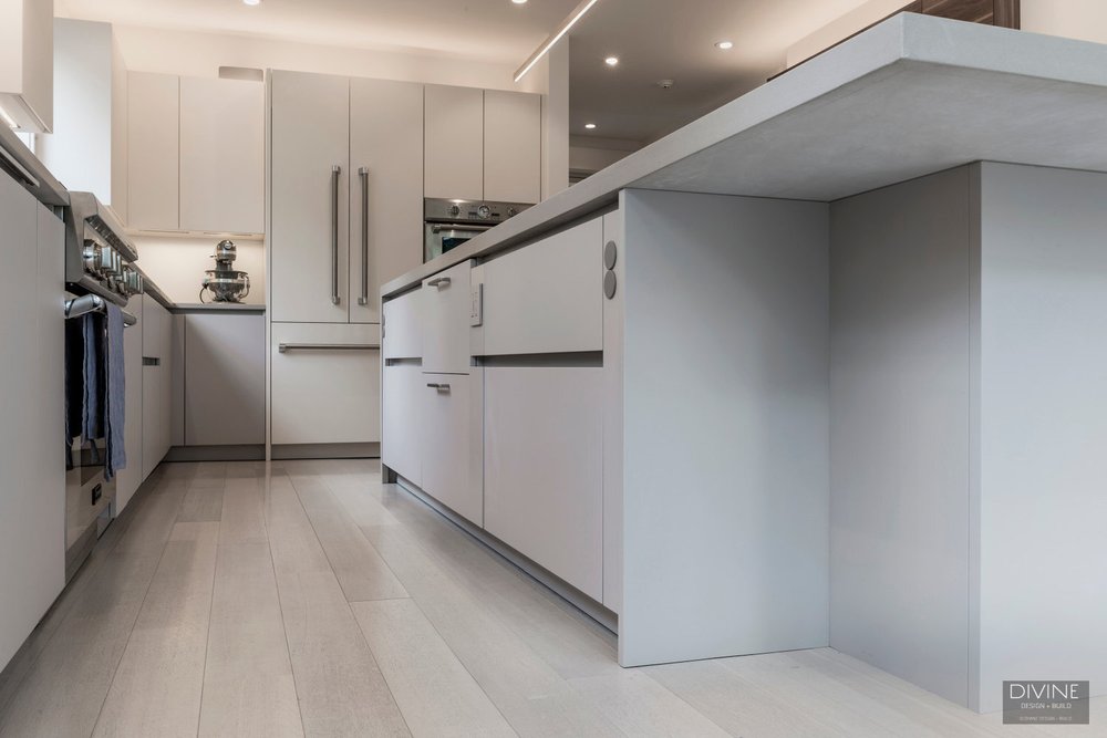 Mar 2, 2017 - Grey hardwood floors vary in many different ways depending on the species of wood, the intensity of the stain, and the variation of the ... Sep 14, 2019 - Super Light Gray Wood Floors Kitchen 32+ Ideas #kitchen #wood. Art Gray Open concept kitchen - small contemporary single-wall concrete floor and gray floor open concept kitchen idea in Los Angeles with an undermount sink, flat-panel cabinets, gray cabinets, metallic backsplash, paneled appliances, solid surface countertops and gray countertops Save Photo Bader Custom Cabinets Meyer Design