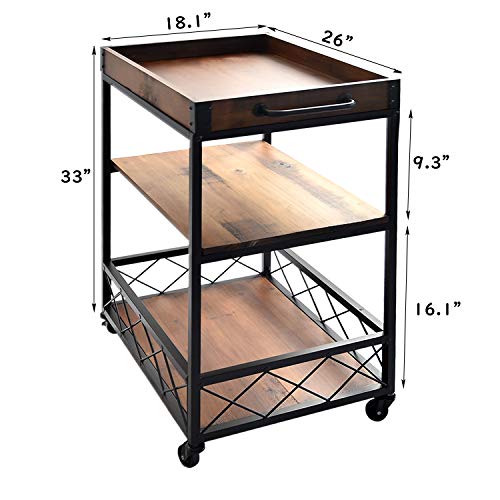 Yaheetech 3 Tier Rolling Kitchen Cart Island Cart on Wheels with Storage Shelf & Drawer Solid Wood Countertop, Espresso