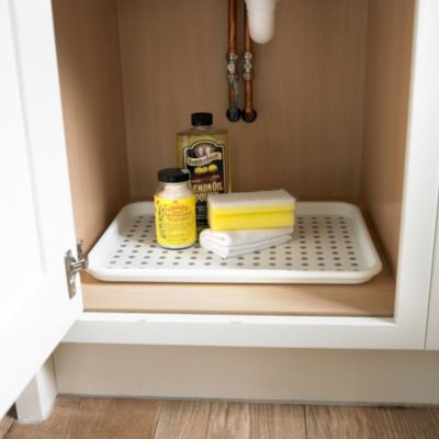 Enjoy free shipping on all purchases over $75 and free in-store pickup on the madesmart Under Sink Drip Tray at The Container Store. An organized under sink area can start with this durable, well-designed tray. Made to protect cabinets from spills and drips, its top surface is finished with a soft-grip material that keeps bottles in place. On the base, nonslip rubberized feet prevent shifting.