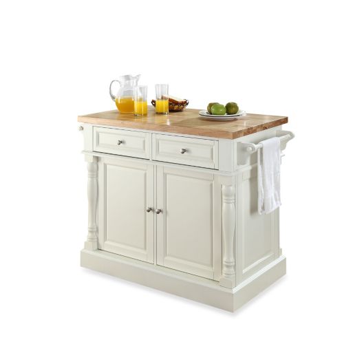 Crosley Butcher Block Top Kitchen Island Reinvent your kitchen space in a smart and affordable way. This beautiful kitchen island features a butcher block top for food prep and a solid hardwood and wood veneer cabinet. This practical, yet stylish kitchen centerpiece also includes elegant raised panel doors on both sides and two deep push ...