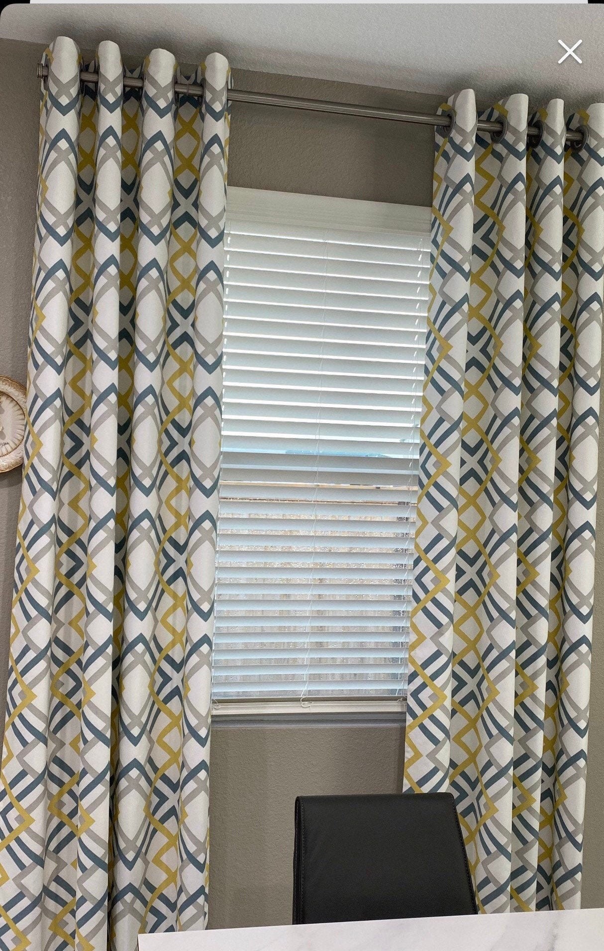 Curtain panels, grommet panels. Blue gray curtains. Yellow gray curtains. Valances. Lined curtains. 1 free pillow cover