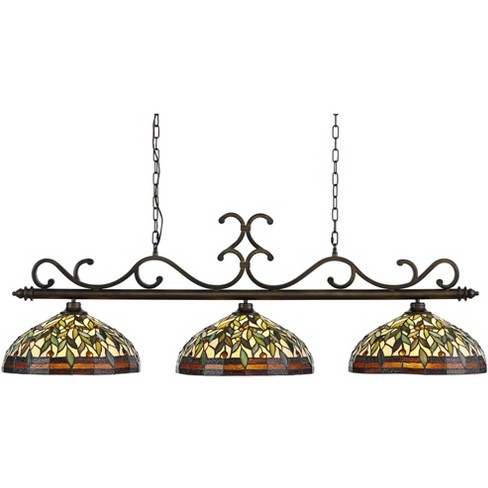 Robert Louis Tiffany Bronze Linear Island Pendant Chandelier 56" Wide Tiffany Style Leaf and Vine Art Glass 3-Light for Kitchen