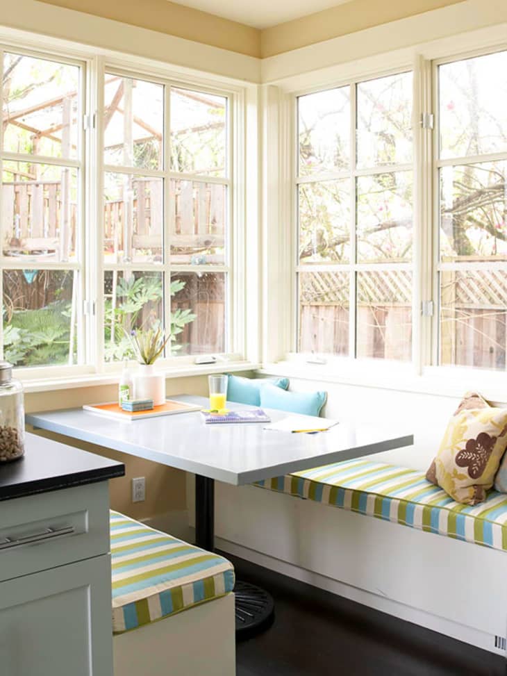 Utilize a sunny kitchen corner with L-shape banquette seating. A simple rectangular table fits snugly against the bench and provides ease of movement in and out of the dining area. Bamboo blinds, muted wall color, and earth-tone upholstery keep the space light and airy.