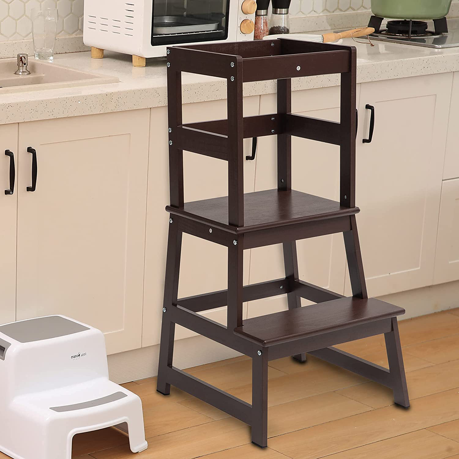 Kitchen stools also called kitchen learning tower is fun, practical and beautiful pieces of furniture to add to your kitchen décor which allows the Our wood is hand-selected, sanded and sharp edges rounded off for added safety. The step stool is finished with an eco-friendly white and gray finish.
