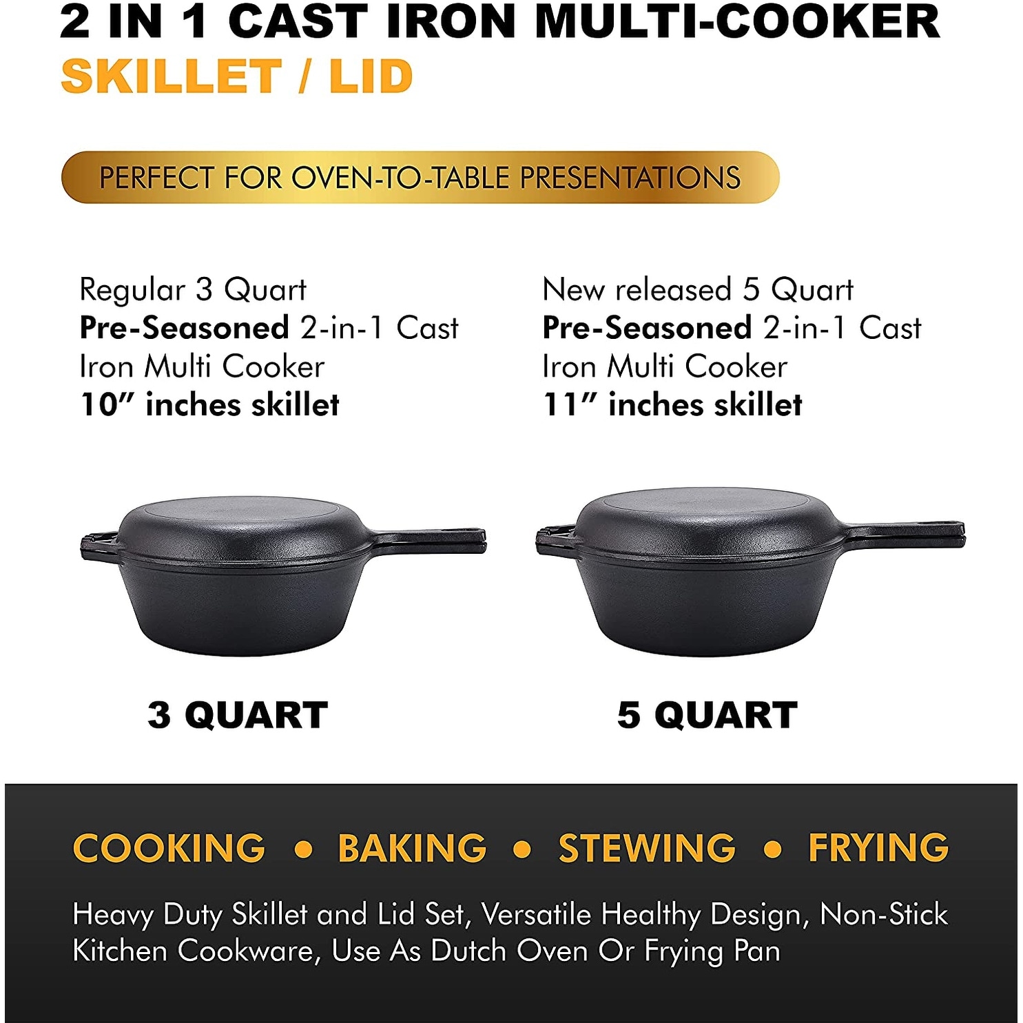2-In-1 Cast Iron Multi-Cooker â Heavy Duty Skillet and Lid Set, Versatile Healthy Design, Non-Stick Kitchen Cookware