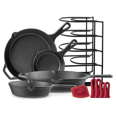 Cuisinel 5 Piece Kitchen Essential Pre Seasoned Cast Iron Chef Cookware Set with 4 Skillets, Heatproof Handle Covers, Rack Organizer, and Pan Scraper