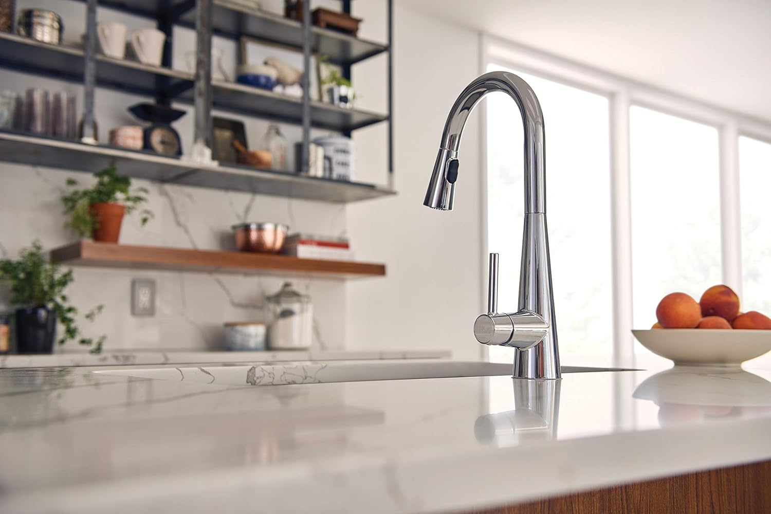 Moen Align High-Arc Pulldown Kitchen Faucet - Chrome ... SKU: 7565 Categories: Kitchen Faucets, Kitchens. Description. Description. From intimate galley kitchens to large gourmet workstations, Align faucets bring a refreshed, modern look to your home. Simple lines create the contemporary style. Moen Align Single Handle High-Arc Pulldown. 15 5/8″ high with a 7-1/2″ reach. Pull-Down Spray.