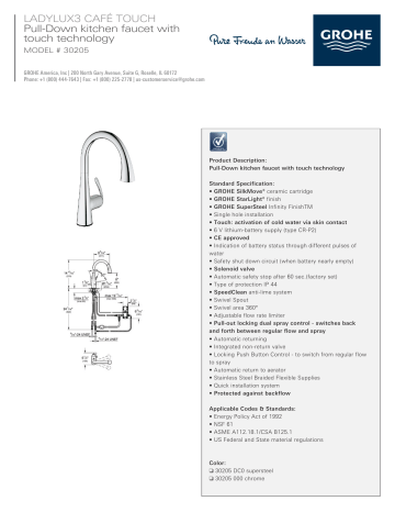 Ladylux3 - GROHE The body flows elegantly into the wide swivel spout, offering distinctive design alongside everyday practicality. Ladylux® comes in two high-quality finishes: our high-gloss GROHE StarLight® chrome or the durable GROHE RealSteel® with anti-bacterial properties. Whichever you choose, GROHE SilkMove® will ensure long-lasting smooth movement. GROHE Zedra Cafe Single-Handle Pull-Down Sprayer Kitchen ... The heritage design Zedra Cafe single-handle pull-down spray head kitchen faucet boasts fluid curves and an elegant, modern silhouette. It stands 13-1/2 in. in height and features a graceful, high-arc gooseneck spout that swivels 360 and extends 8-1/8 in. in reach. Discount Grohe 30205 LadyLux3 Cafe Touch Single-Handle ... Grohe 30205 LadyLux3 Cafe Touch Single-Handle Kitchen Faucet get special price. Many customer in worldwide who currently made a decision to compare and buy the best offers of Grohe 30205 LadyLux3 Cafe Touch discount in their special occassions best deals 2014 made positive reviews based for their experiences with the cheap Grohe 30205 LadyLux3 ... PDF 32 298 Ladylux Café GROHE WaterCare 5.7 L/min o 1.5 gpm/60 psi •Presión - mín. 7.25 psi - recomendada 14.5 - 72.5 psi - si la presión es superior a 72.5 psi, se deberá instalar una válvula reductora de presión •Presión de utilización máx. 145 psi •Presión de verificación 232 psi •Temperatura .