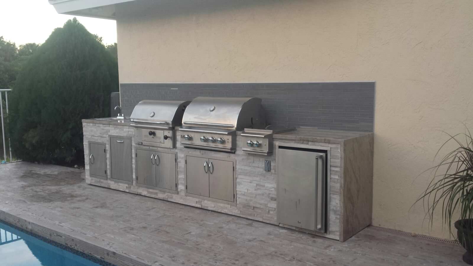 Grill Islands - Outdoor Kitchens - The Home Depot 7 ft. Stone Veneer Grill Island with Tile Top and 4-Burner Gas Grill in Stainless Steel A classy and stylish BBQ Island that is wonderful A classy and stylish BBQ Island that is wonderful for cooking and entertaining family and friends or preparing an intimate meal for that special someone. The LBK 710 comes standard with a G4, 4-burner grill, side burner, double access door and a stainless ...