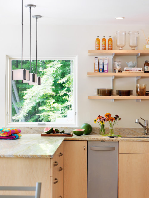 Lake House Design Ideas | Houzz This magnificent open kitchen, designed by Curtis Lumber, Inc., makes the most of the lake view. The kitchen features Wellborn Cabinetry in the Bristol Door Style. The perimeter and island cabinetry are Bright White and the Refrigerator Wall is Maple Bleu. The perimeter countertop is quartz and the homeowner built the wood top for the island.