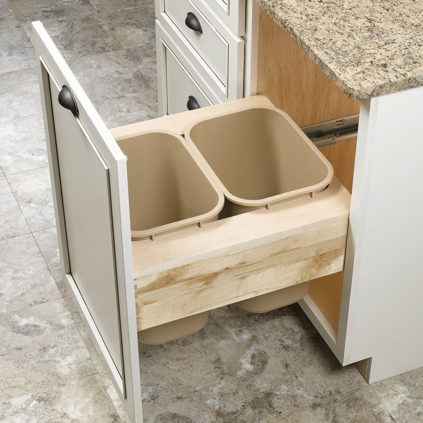 Double Trash Can Pull-out - Kemper Cabinetry To ensure highest satisfaction we suggest you view an actual sample from your dealer for best color, wood grain, and finish representation. See your designer for details. Description Make life simpler with two trash cans stowed away neatly in one cabinet. See It In Action Double Trash Can Pull-out Where to buy: Ready to make your kitchen your own?