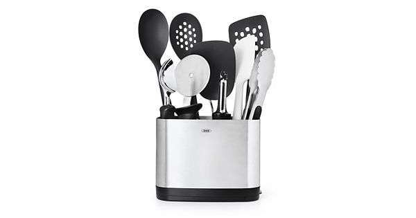OXO Good Grips® 15-Piece Kitchen Tool Set | Bed Bath & Beyond The OXO Good Grips 15-Piece Kitchen Tool Set offers an attractive stainless steel utensil holder to keep all your utensils in a handy spot. The elliptical shape fits easily in narrow spaces and holds all your necessary tools. Contoured bottom keeps tools upright, and the removable tray makes cleaning easy