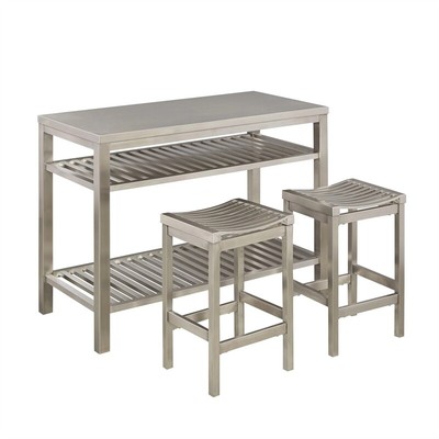 Stainless Steel Top Kitchen Prep Cart W/Uph Saddle Stools Two large storage drawers can store utensils and other small kitchen items. The Saddle Stools provide a comfortable spot to sit for a cup of coffee or a quick meal on the beautiful stainless steel countertop. The Kitchen Prep Cart with Saddle Stools is a must-have for your kitchen or dining area. Transitional design; Stainless steel top; Cherry ...