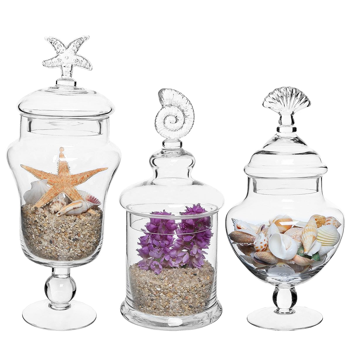 Simply Elegant Set of 3 Clear Glass Apothecary Jars with Lids, Storage ... Add an elegant decorative display to your home with this set of 3 clear glass apothecary jars; 〠GREAT FOR ALL OCCASIONSã€'Perfect Gifts for Housewarming, Wedding Present and Christmas and etc. Also Perfect for use in wedding centerpieces, candy buffets, decor. Elegant crystal clear glass