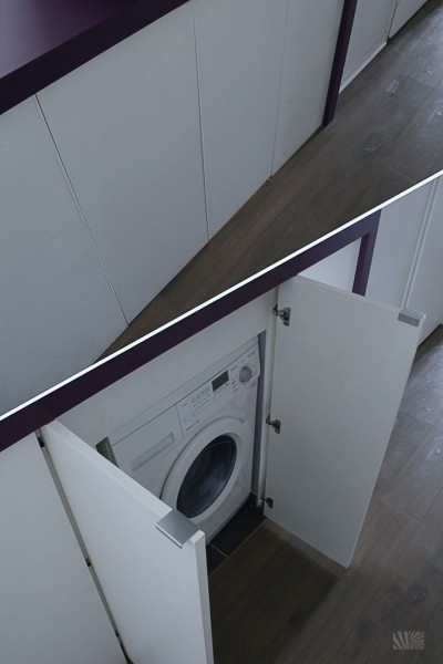 Stylish IKEA Kitchen For Small Space | iDesignArch | Interior Design ... This modern purple and white kitchen design utilizes materials from IKEA to create a stylish small kitchen. The tiny area requires intelligent use of space. The washer is neatly tucked inside the cupboard, and a small fridge under the counter allows more room for cabinets.