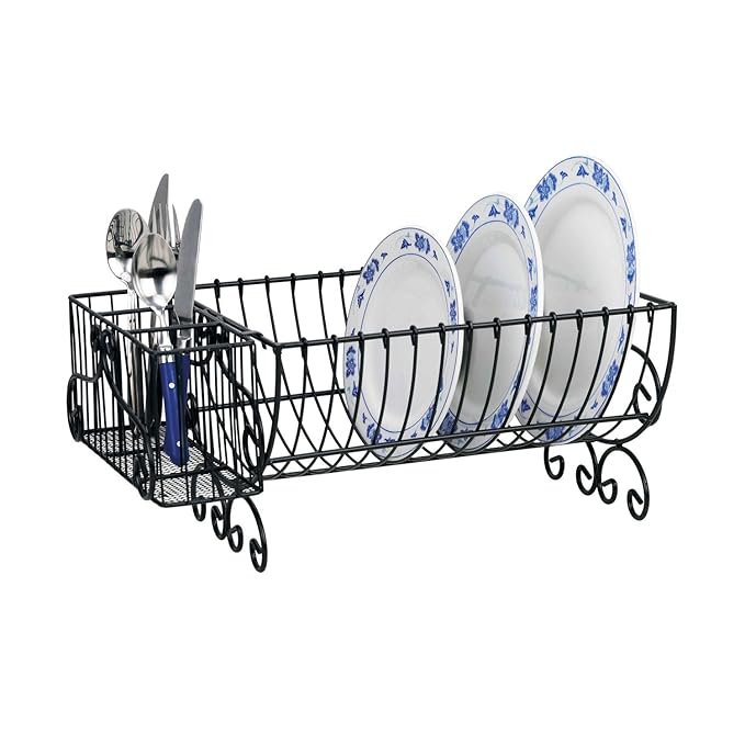 Shopping edit: 10 fancy dish drainers for a tidy worktop Plates, pots, pans, bowls and glasses fit perfectly on this rack, while there's a dedicated cutlery caddy that's removable. With a sturdy steel construction and an anti-rust finish, it should last in your kitchen for years. Not to mention it's also a bargain! Material: Steel. Size: L44.6cm x W29.5cm x H12.5cm.