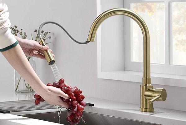 WOWOW Single Handle Gold Kitchen Faucet with Pull Down Sprayer WOWOW Single Handle Gold Kitchen Faucet with Pull Down Sprayer Description WOWOW Utility Kitchen Faucet with Sprayer! Great Helper to Upgrade Your Kitchen Life Food-grade 304 stainless steel faucet -Not just a stainless finish. It is lead-free and rust-free, which ensures water safety.