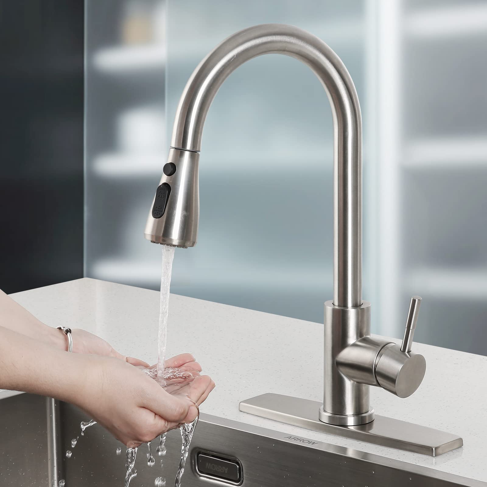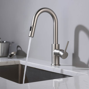 One Touch Kitchen Faucets Brushed Nickel Stainless | Wayfair Pull down single handle stainless steel kitchen faucet brushed nickel sink faucet with deck plate. Product Type: Single Handle Kitchen Faucet; Overall Faucet Height - Top to Bottom: 18.1'' Primary Material: Stainless Steel; Spout Reach - Front to Back: 8.81'' Spout Height - Top to Bottom: 11.01''