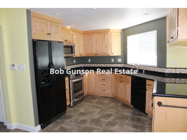 Kitchens with black appliances and oak cabinets
