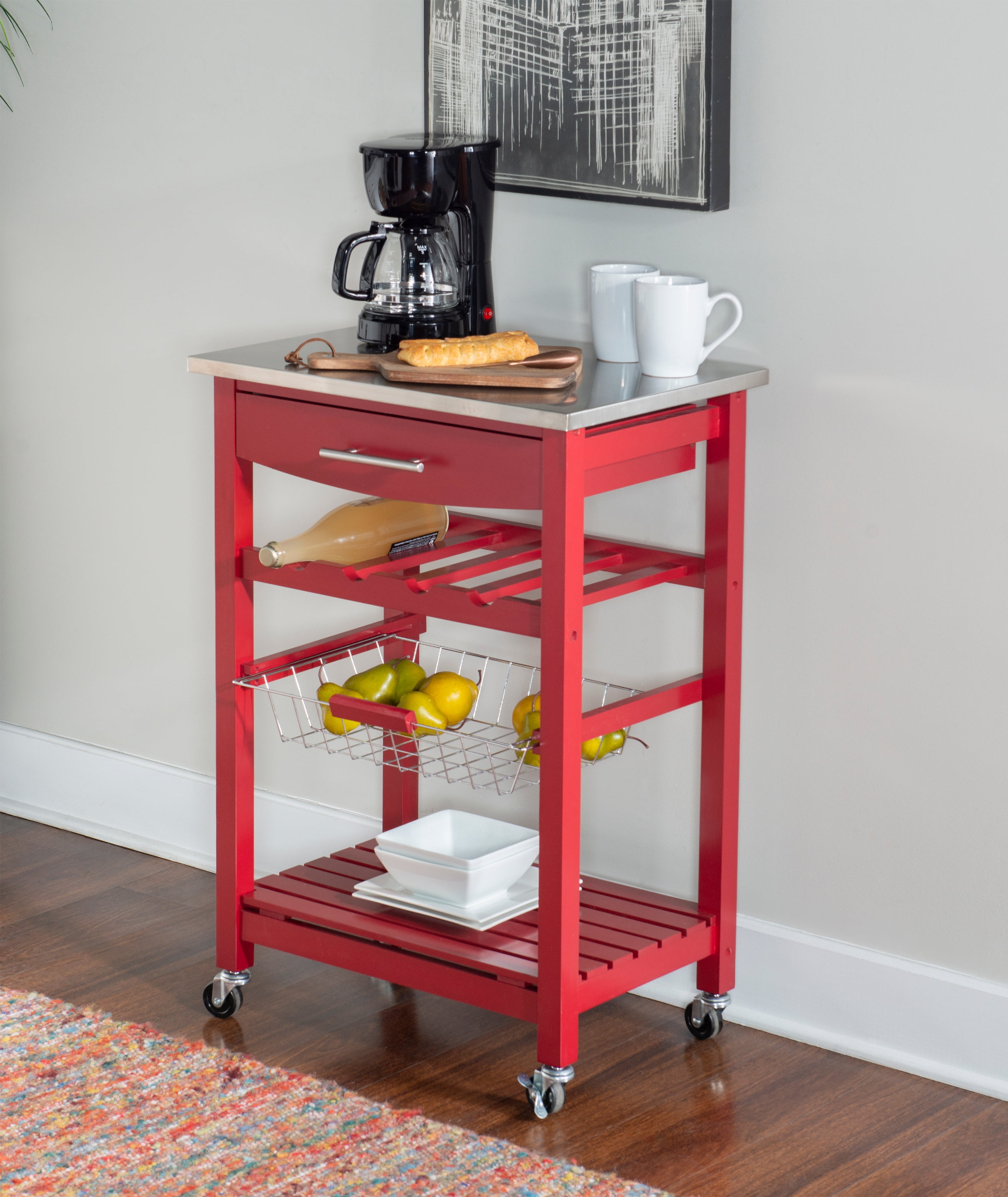 Linon Corbari Mobile Kitchen Cart with Food Safe Stainless Steel Top, Red Finish