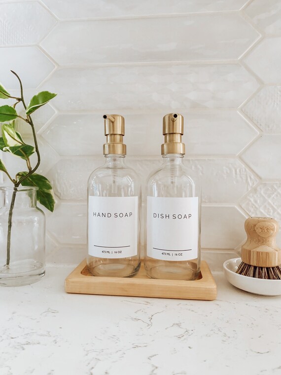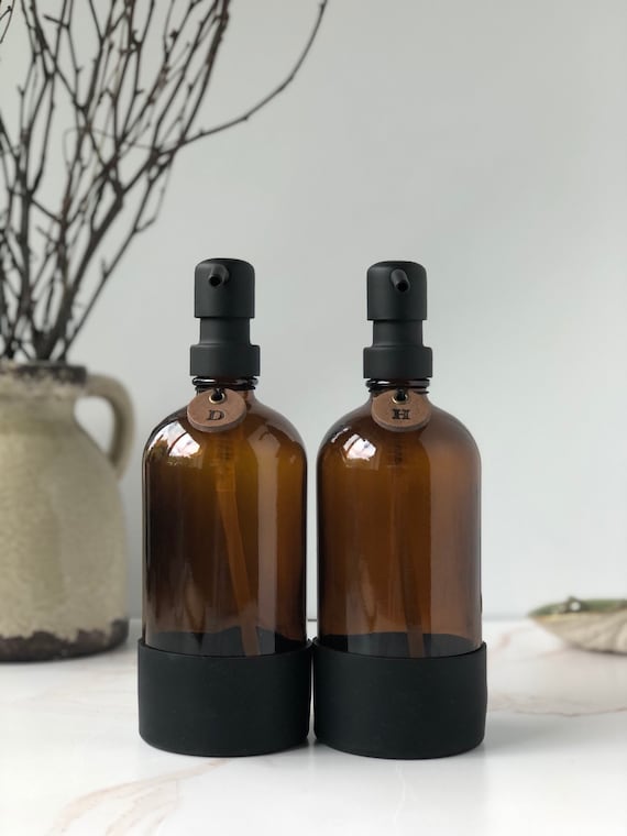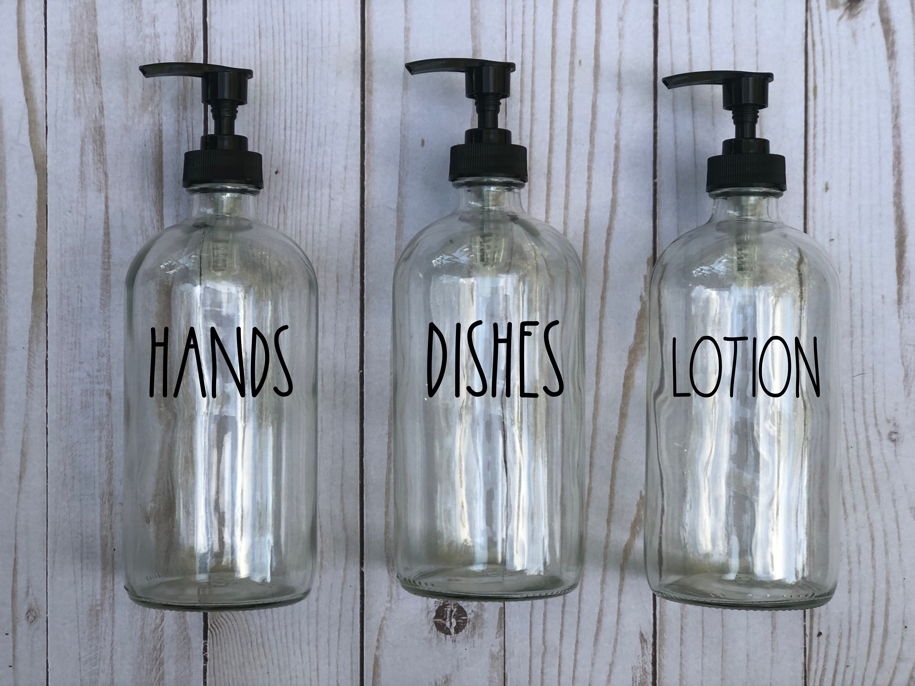 Amber Glass Dish Soap and Hand Soap Dispensers - Glass Soap Pumps with Waterproof Labels - FREE SHIPPING