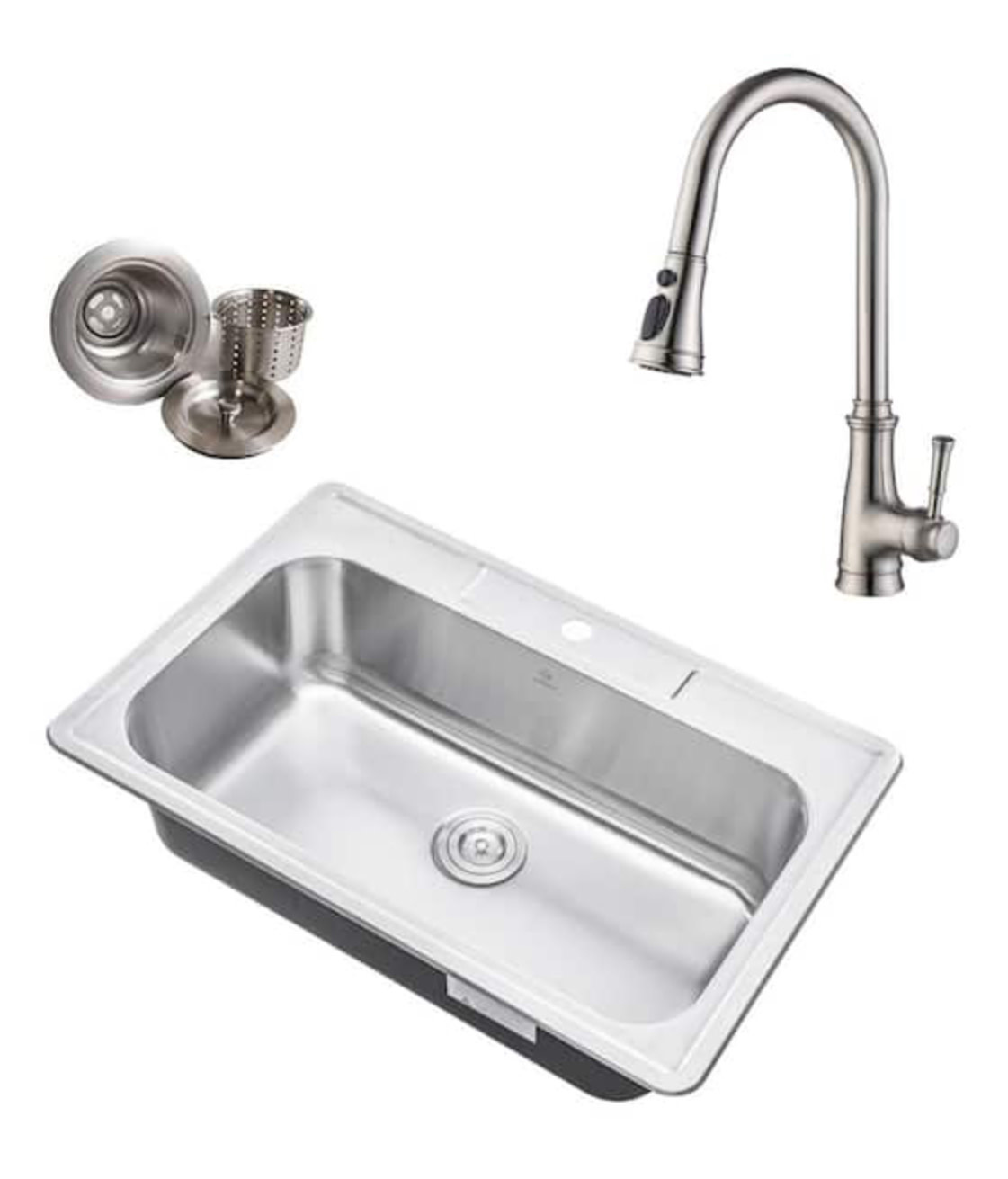 Sink w/ Faucet - Kitchen Sinks - Kitchen - The Home Depot KOHLER Cursiva All-in-One Stainless Steel 33 in. Single Bowl Drop-In or Undermount Kitchen Sink with Faucet. Model# K-RH28174-1PC-NA (68) $ 389 00. Exclusive. AKDY All-in-One Matte Black Finished Stainless Steel 33 in. x 22 in. Single Bowl Drop-in Kitchen Sink with Spring Neck Faucet. Model# KS0531-KF12 (98)