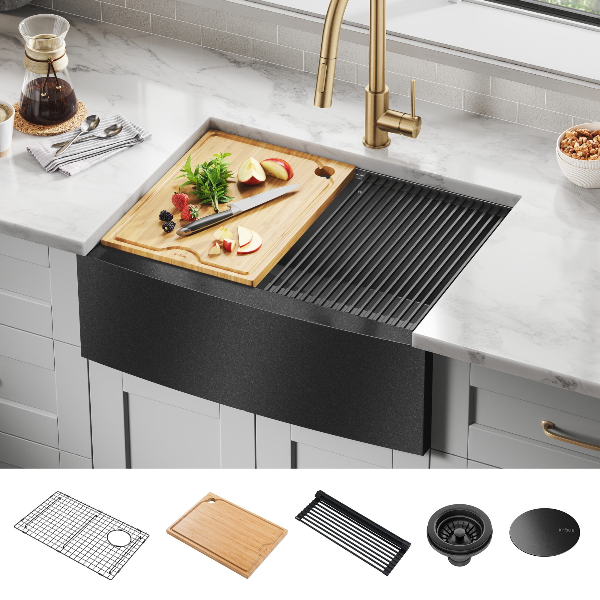 › apron-front-sinksKraus USA | Apron Front Sinks | Kitchens A Stylish Selection. Kraus has endless options to upgrade your kitchen style, whether you prefer a sleek, modern stainless steel sink, or a traditionally inspired fireclay model that creates an enticing centerpiece, conjuring up memories, tastes, and smells; whether you prefer classic curves or a modern flat apron front that beautifully integrates into the surrounding cabinets and countertops.