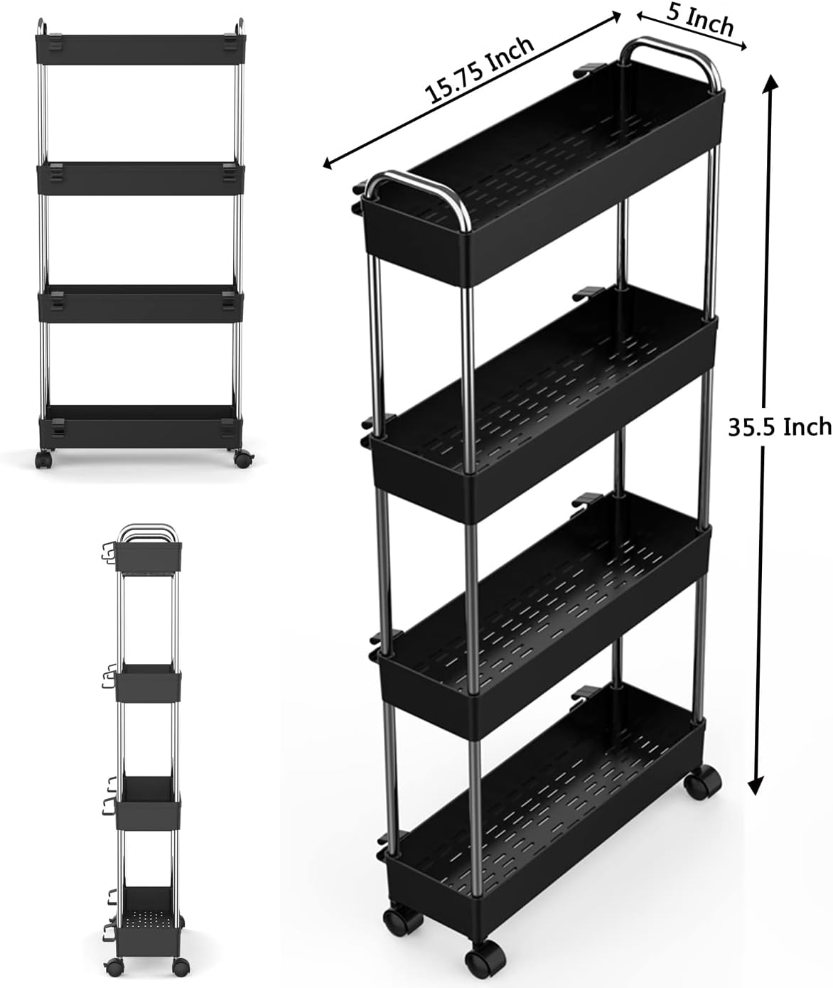 Slim Storage Cart, 4 Tier Mobile Shelving Unit Organizer, Utility Rolling Shelf Cart with Wheels, Slide Out Storage Shelves Cart for Kitchen, Living ...